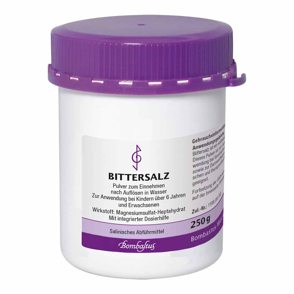 Bittersalz, Wirkstoff: Magnesiumsulfat-Heptahydrat. Salinisches Abführmittel für Kinder über 6 Jahren und Erwachsene, zur kurzfristigen Anwendung bei Verstopfung (Obstipation) sowie zur Darmentleerung vor diagnostischen und therapeutischen Maßnahmen. Zu Risiken und Nebenwirkungen lesen Sie die Packungsbeilage und fragen Sie Ihre Ärztin, Ihren Arzt oder in Ihrer Apotheke. Bombastus-Werke AG, 01705 Freital, Deutschland