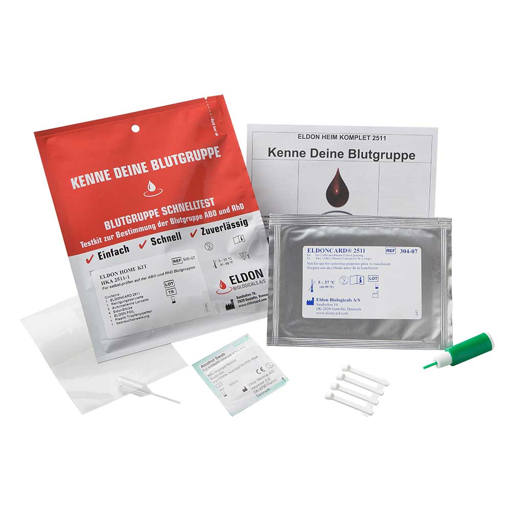 Das ELDON HEIM KOMPLET 2511 ist ein in vitro Diagnose-Kit für Laien, die ihre Blutgruppe innerhalb des ABO- und Rhesus-D-Systems mittels einer ELDONCARD 2511 ermitteln wollen. Ein Test pro Karte ist möglich.