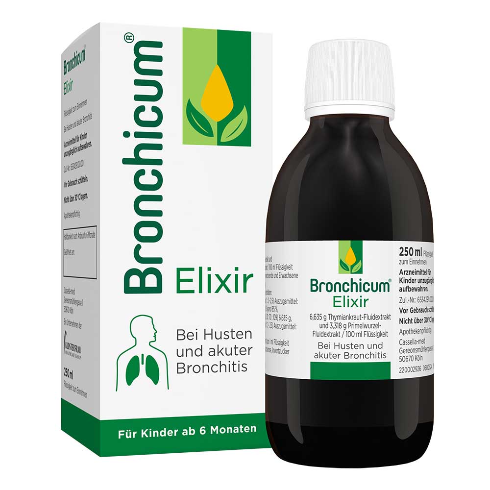 Bronchicum® Elixir. Anwendungsgebiete: Behandlung der Symptome einer akuten Bronchitis und Erkältungskrankheiten der Atemwege mit zähflüssigem Schleim. Warnhinweise: Enthält 4,9 Vol.-% Alkohol. Enthält Sucrose (Zucker) und Invertzucker. Packungsbeilage beachten. Zu Risiken und Nebenwirkungen lesen Sie die Packungsbeilage und fragen Sie Ihre Ärztin, Ihren Arzt oder in Ihrer Apotheke.
