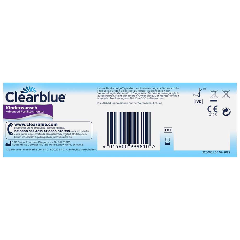 - es werden Teststäbchen benötigt, welche separat in der Clearblue Fertilitätsmonitor Advanced Teststäbchen-Nachfüllpackung erhältlich sind: Clearblue Fertilitätsmonitor Teststäbchen 30+3 (30 Fruchtbarkeitstests für den Eisprung & 3 Schwangerschaftstests=