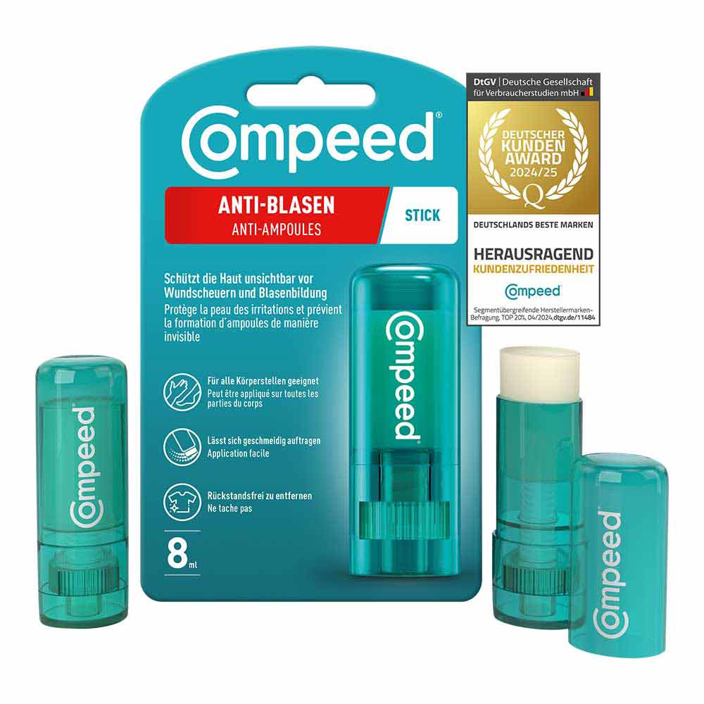 Der Compeed® Anti-Blasen Stick hilft unsichtbar, Reibung und Wundscheuern vorzubeugen. Somit ist der Compeed® Anti-Blasen Stick effektiv in der Vorbeugung von Blasen. Er verhindert die Blasenbildung bei 9 von 10 Konsumenten*. Der Stick ist nicht nur für wunde Stellen an den Füßen geeignet. Der pflegende Fettfilm kann auch an anderen Stellen des Körpers aufgetragen werden, wann immer stärkerer Reibung auftreten. Da die Fettschicht des Sticks auf Pflanzenöl basiert, wird die Haut gleichzeitig gepflegt und somit geschmeidig gehalten.