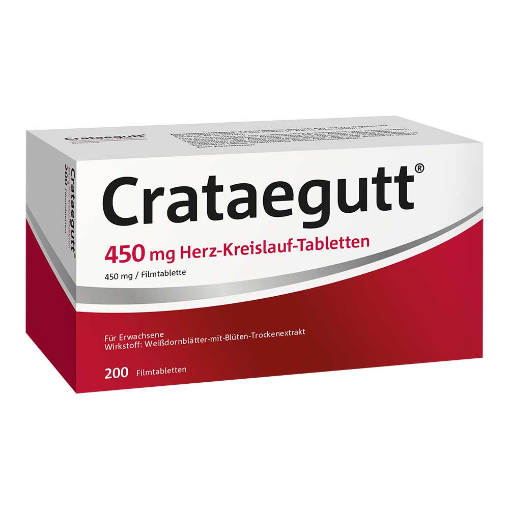 Crataegutt® 450 mg Herz-Kreislauf-Tabletten. Wirkstoff: Weißdornblätter-mit-Blüten-Trockenextrakt. Wirkstoff: Weißdornblätter-mit-Blüten-Dickextrakt. Anwendungsgebiete: Traditionelles pflanzliches Arzneimittel zur Anwendung bei: Unterstützung der Herz-Kreislauf- Funktion, ausschließlich auf Grund langjähriger Anwendung. Zu Risiken und Nebenwirkungen lesen Sie die Packungsbeilage und fragen Sie Ihre Ärztin, Ihren Arzt oder in Ihrer Apotheke. Dr. Willmar Schwabe GmbH & Co. KG – Karlsruhe
