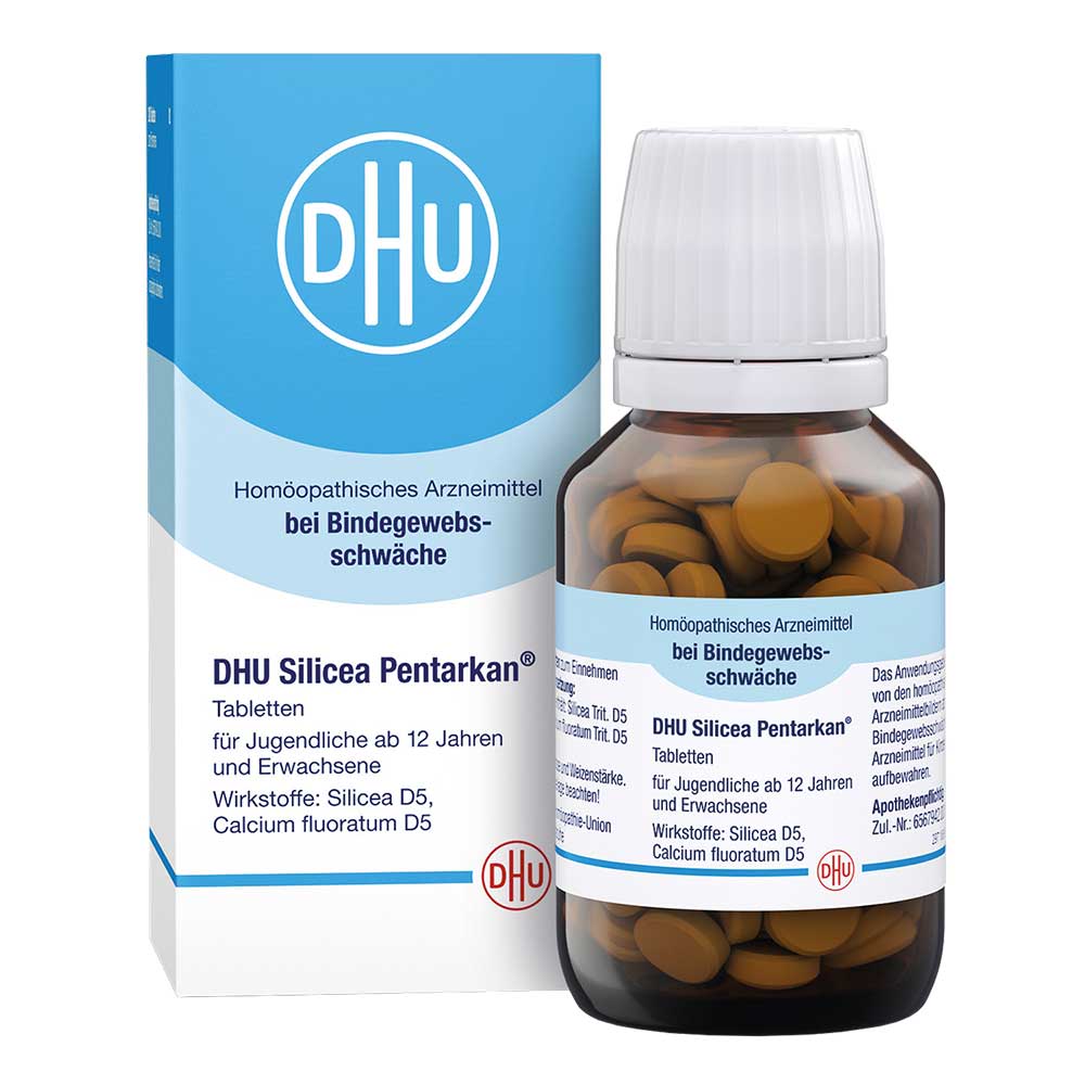 DHU Silicea Pentarkan®.Anwendungsgebiete: Das Anwendungsgebiet leitet sich von den homöopathischen Arzneimittelbildern ab. Dazu gehört: Bindegewebsschwäche. Enthält Lactose und Weizenstärke. Packungsbeilage beachten! Zu Risiken und Nebenwirkungen lesen Sie die Packungsbeilage und fragen Sie Ihre Ärztin, Ihren Arzt oder in Ihrer Apotheke. Deutsche Homöopathie-Union DHU Arzneimittel GmbH & Co. KG