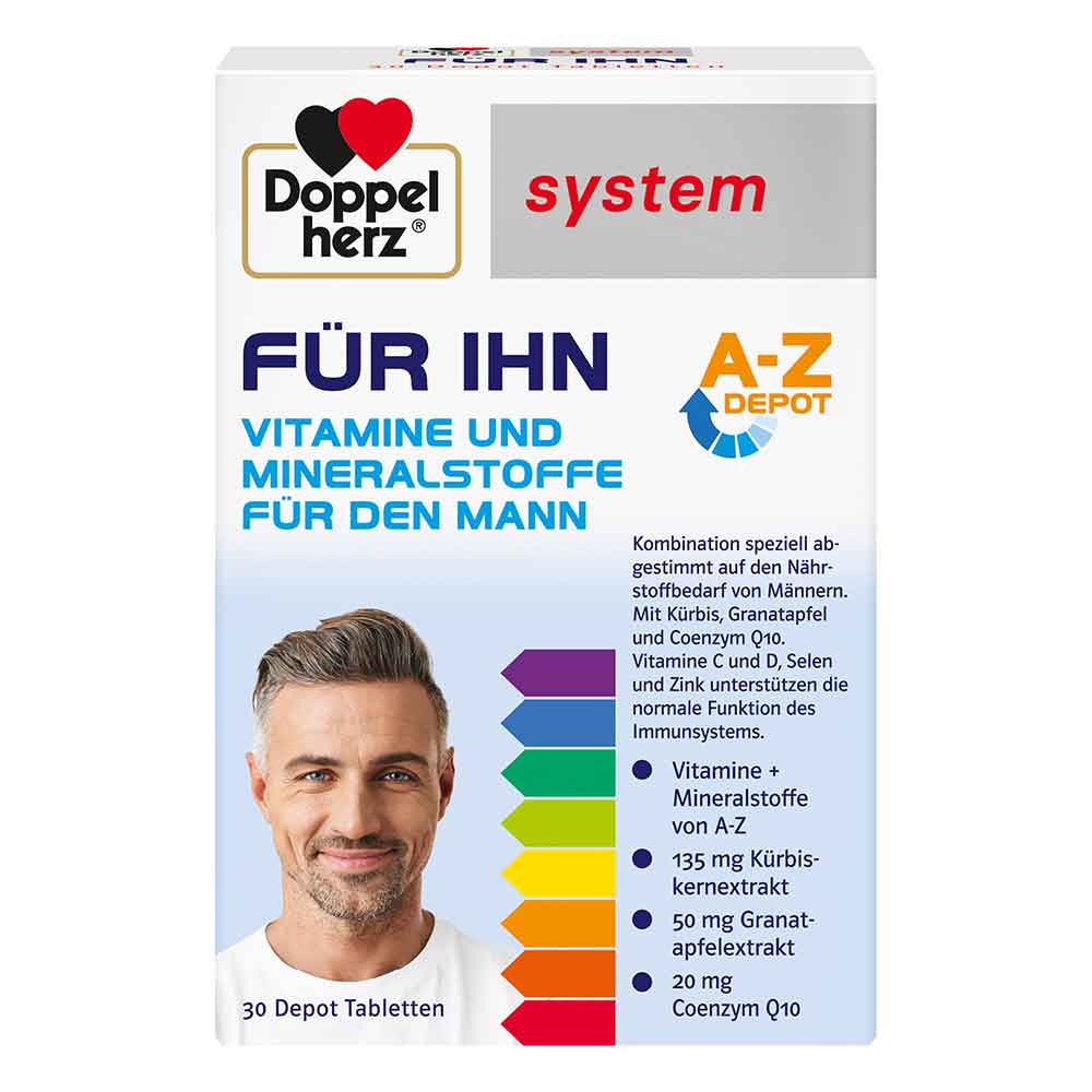 Doppelherz system FÜR IHN beinhaltet ausgesuchte Vitamine, Mineralstoffe und Spurenelemente, um die Versorgung mit diesen Nährstoffen bzw. einen erhöhten Bedarf zu decken.