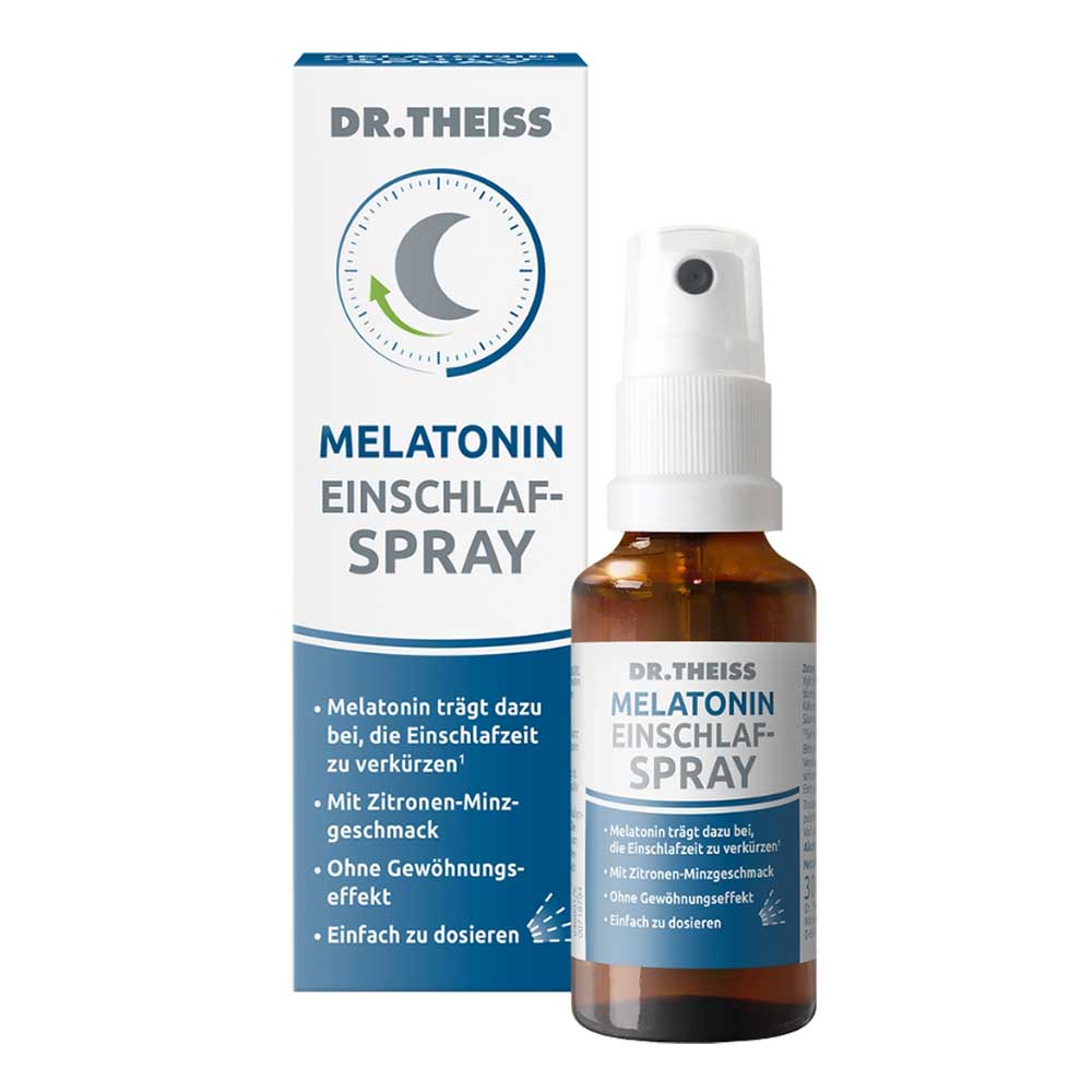 Dr. Theiss Melatonin Einschlaf-Spray kombiniert Melatonin mit Passionsblumenextrakt. Melatonin trägt dazu bei, die Einschlafzeit zu verkürzen1 und trägt zur Linderung der subjektiven Jetlag-Empfindung bei 2. Das leicht anzuwendende Spray ist dank Sprühkopf einfach zu dosieren.