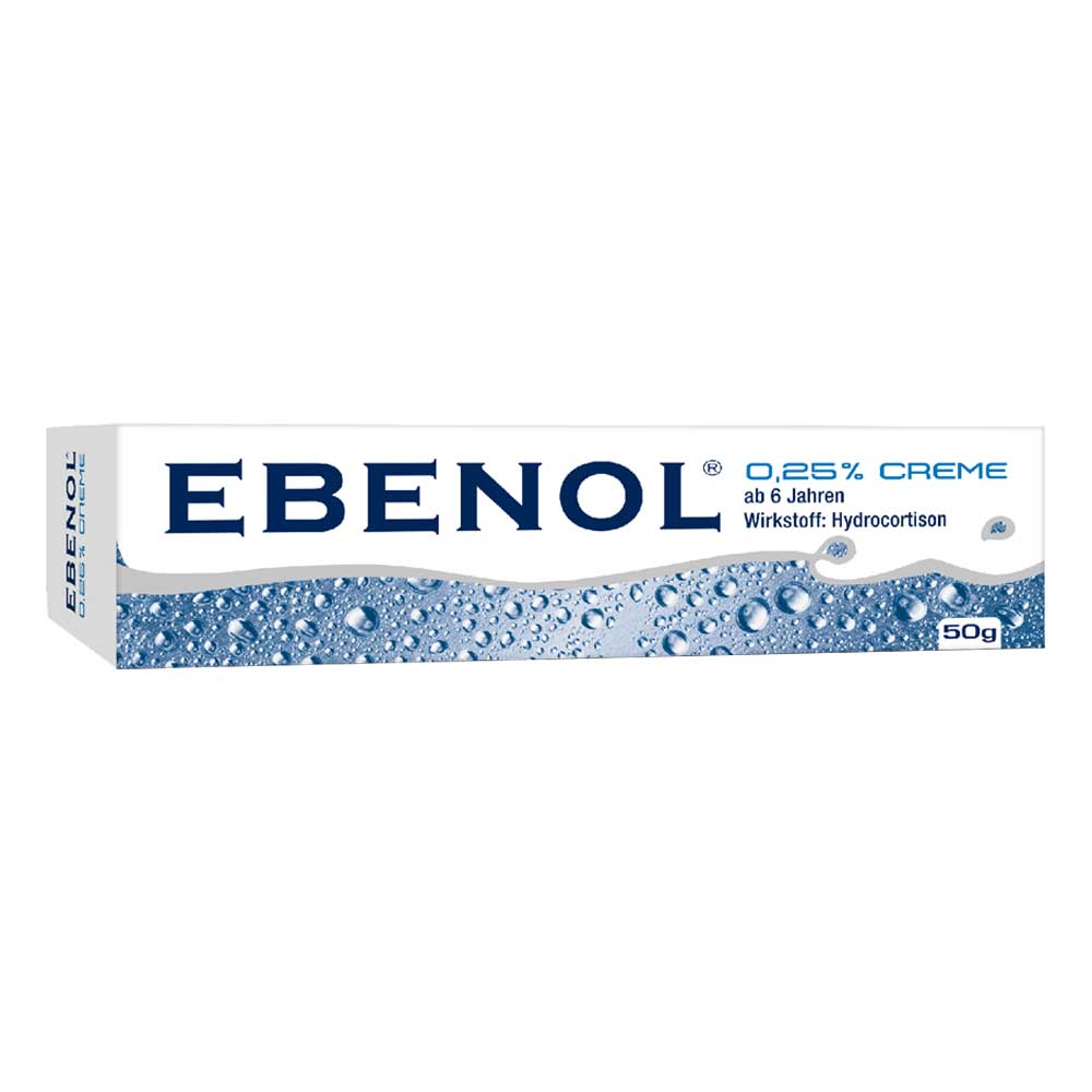 EBENOL® 0,25 % Creme. Für Erwachsene und Kinder ab 6 Jahren. Wirkstoff: Hydrocortison. Anwendungsgebiet: Zur Linderung von leicht ausgeprägten entzündlichen Hauterkrankungen. Warnhinweis: enthält Cetylstearylalkohol und Kaliumsorbat. Packungsbeilagen beachten. Stand: 07.2023. Zu Risiken und Nebenwirkungen lesen Sie die Packungsbeilage und fragen Sie Ihre Ärztin, Ihren Arzt oder in Ihrer Apotheke.
