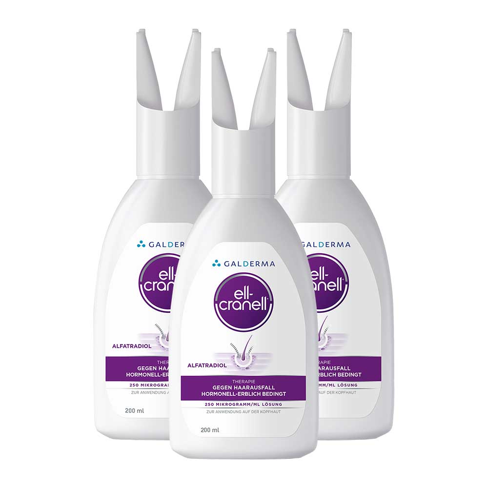 Ell-Cranell 250 Mikrogramm/ml. Wirkstoff: Alfatradiol. Anwendungsgebiete: Zur Steigerung der verminderten Anagenhaarrate bei der leichten androgenetischen Alopezie (hormonell-erblich bedingter Haarausfall) bei Männern und Frauen. Zu Risiken und Nebenwirkungen lesen Sie die Packungsbeilage und fragen Sie Ihre Ärztin, Ihren Arzt oder in Ihrer Apotheke.