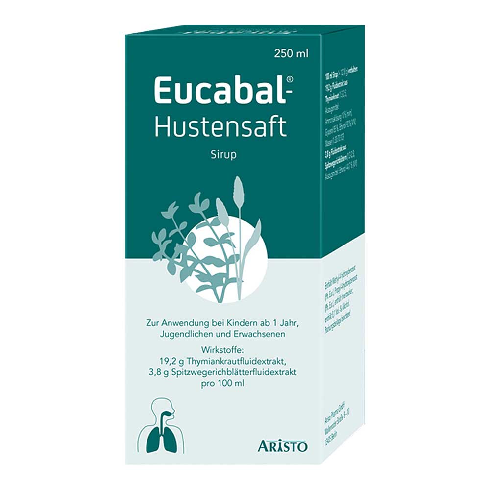 Eucabal®-Hustensaft. Wirkstoffe: Thymianfluidextrakt, Spitzwegerichblätterfluidextrakt. Traditionelles pflanzliches Arzneimittel zur Besserung der Beschwerden bei Erkältungskrankheiten der Atemwege. Das Arzneimittel ist ein traditionelles Arzneimittel, das ausschließlich auf Grund langjähriger Anwendung für das Anwendungsgebiet registriert ist. Enthält 8,1 Vol.-% Alkohol, Methyl-4-hydroxybenzoat, Propyl-4-hydroxybenzoat, Invertzucker und Saccharose. Packungsbeilage beachten. Zu Risiken und Nebenwirkungen lesen Sie die Packungsbeilage und fragen Sie Ihre Ärztin, Ihren Arzt oder in Ihrer Apotheke. Apothekenpflichtig. (Stand November 2023). Aristo Pharma GmbH, Wallenroder Straße 8-10, 13435 Berlin.