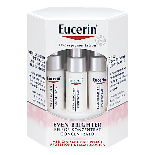 Studien beweisen, dass Eucerin EVEN BRIGHTER Pflege-Konzentrat Pigmentflecken sichtbar mildert und der Haut ein strahlenderes, ebenmäßigeres Aussehen verleiht. Es enthält B-Resorcinol in einer hohen Konzentration, um die Melaninproduktion im Ursprung zu reduzieren, ist dabei aber sanft genug für die tägliche Anwendung. Das Eucerin EVEN BRIGHTER Pflege-Konzentrat wird unter der Eucerin EVEN BRIGHTER Tagespflege aufgetragen. Bereits ab 4 Wochen sind Pigmentflecken gemildert, der Teint wird wieder ebenmäßig und strahlend – ein Effekt, der sich bei regelmäßiger Anwendung kontinuierlich verbessert.