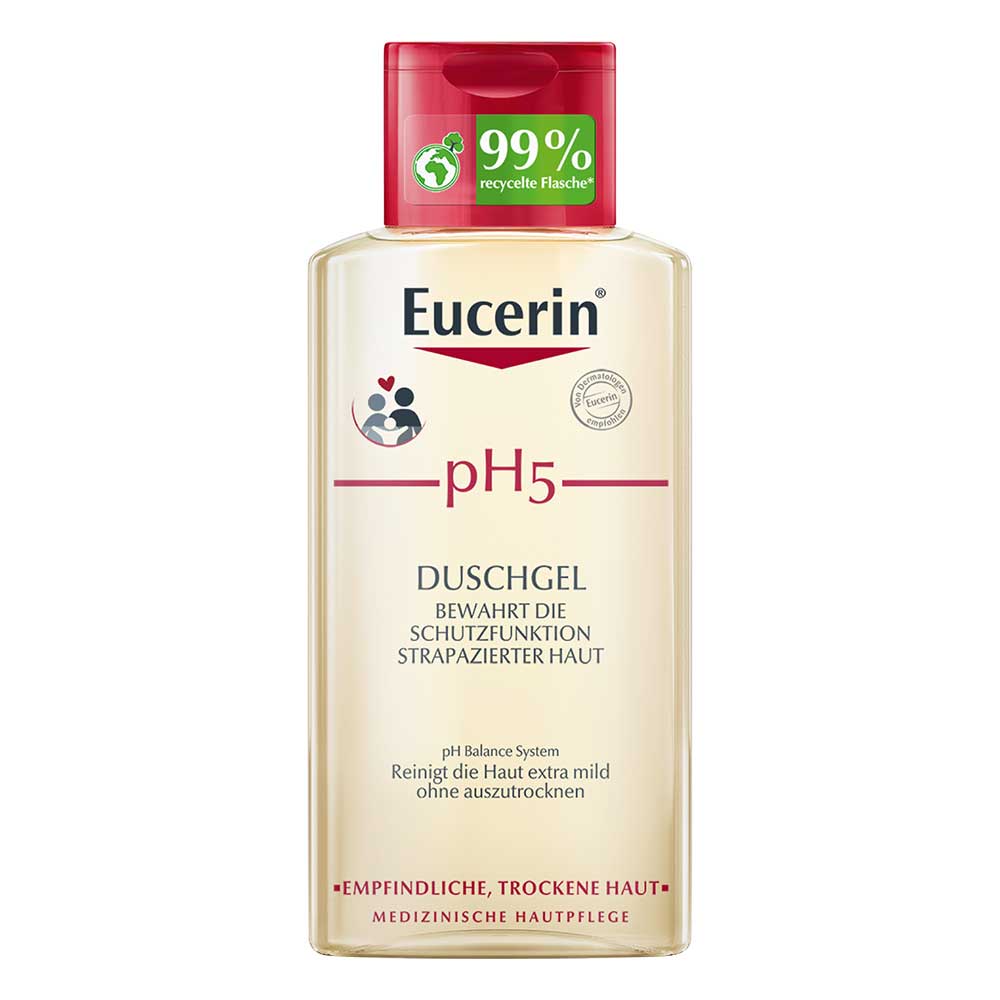 Eucerin pH5 Duschgel ist ein seifenfreies Reinigungsprodukt, das für die tägliche Reinigung von Gesicht und Körper geeignet ist. Die Formel mit dem natürlichen pH-Wert und Dexpanthenol bewahrt nachweislich die natürliche Schutzfunktion und Widerstandskraft der Haut und reinigt sanft mit extra milden, seifenfreien Tensiden. Das Duschgel ist dezent parfümiert und ist auch für Babys und Kinder geeignet.
