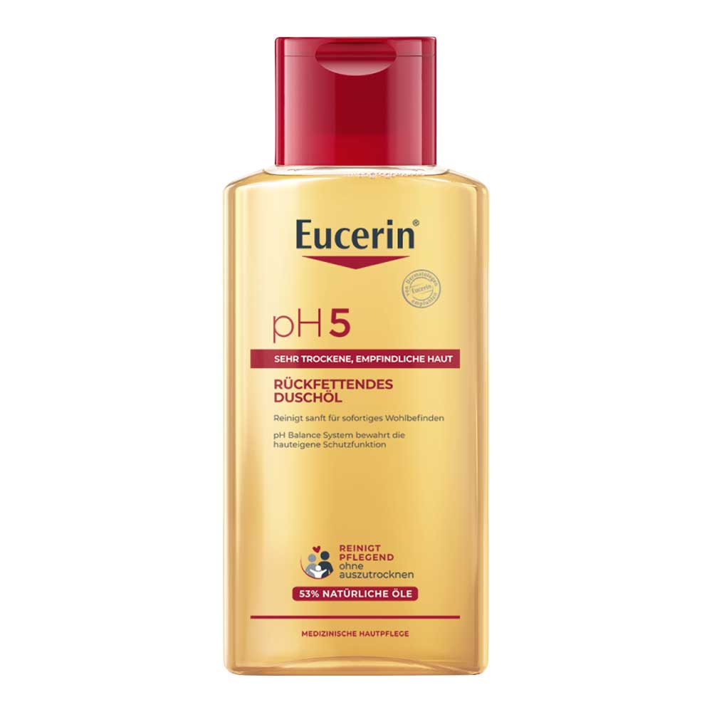 Eucerin pH5 Duschöl wurde speziell mit extra milden Tensiden zur Reinigung trockener, empfindlicher Haut entwickelt. Die Formel mit dem natürlichen pH-Wert und Dexpanthenol bewahrt nachweislich die natürliche Schutzfunktion und Widerstandskraft der Haut und reinigt sanft mit einem hohen Anteil natürlicher Pflegeöle.
