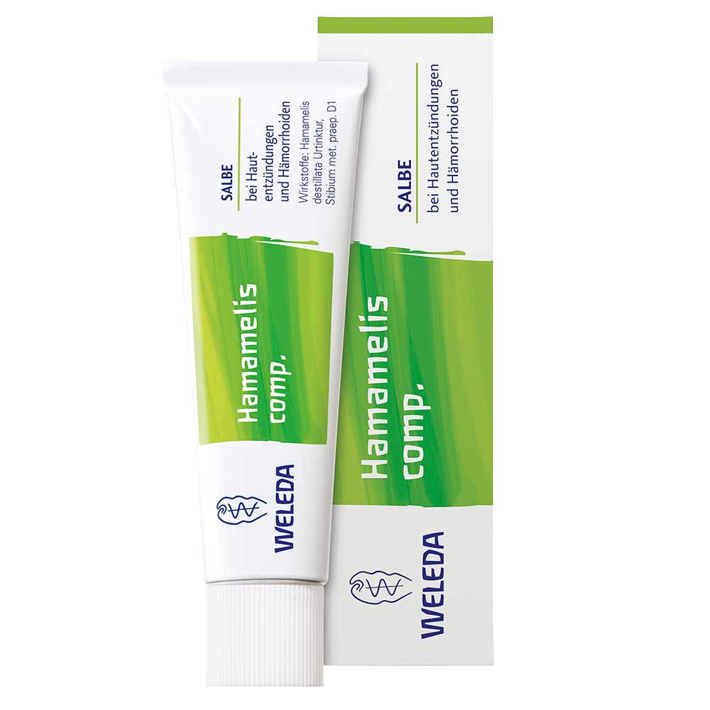 Bei Hautentzündungen und Hämorrhoiden wirkt die Salbe Hamamelis comp. von Weleda nicht nur lindernd auf den Schmerz, sondern auch den oft unangenehmen Juckreiz. Die Wirkstoffe Zaubernuss (Hamamelis virginia) und Stibium metallicum praeparatum hemmen die Entzündung und unterstützen die Haut bei der Heilung. Nässende Stellen können abtrocknen. Dazu kommt: Die Wände der Hämorrhoidalvenen werden vitalisiert und tonisiert, so dass sie sich wieder in ihre ursprüngliche Form zurückziehen können.