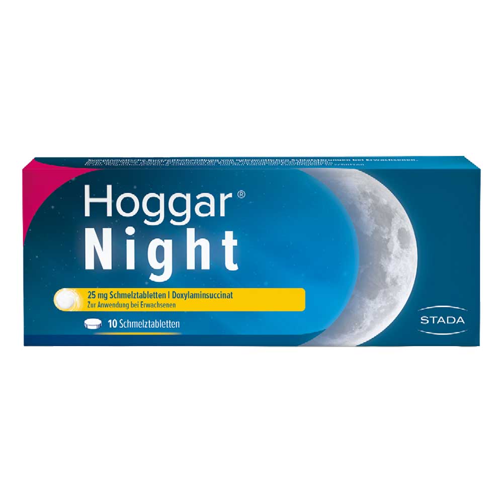Hoggar® Night 25 mg Schmelztabletten Zur Anwendung bei Erwachsenen. Wirkstoff: Doxylaminsuccinat. Zur symptomatischen Kurzzeitbehandlung von gelegentlichen Schlafstörungen bei Er-wachsenen. Hinweis: Nicht alle Schlafstörungen bedürfen einer medikamentösen The-rapie. Oftmals sind sie Ausdruck körperlicher oder seelischer Erkrankungen und können durch andere Maßnahmen oder eine Therapie der Grundkrankheit beeinflusst werden. Deshalb sollte Hoggar® Night nicht zur Dauerbehandlung von länger anhaltenden Schlaf-störungen angewendet werden. Suchen Sie stattdessen Ihren behandelnden Arzt auf. Hinweis: Enthält Glucose und Natrium. Zu Risiken und Nebenwirkungen lesen Sie die Packungsbeilage und fragen Sie Ihre Ärztin, Ihren Arzt oder in Ihrer Apotheke. STADA Consumer Health Deutschland GmbH, Stadastraße 2–18, 61118 Bad Vilbel Stand: Oktober 2023