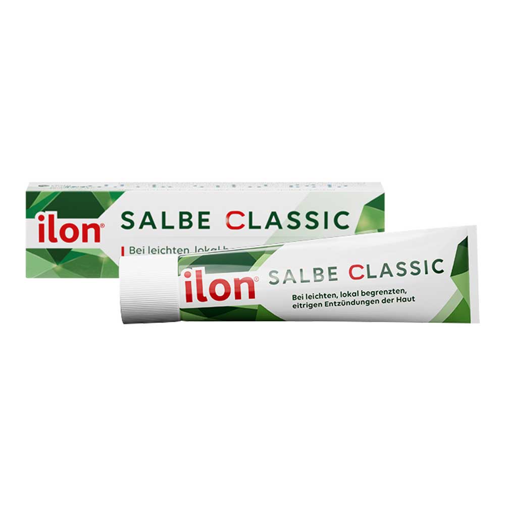ilon® Salbe classic. Wirkstoffe: Lärchenterpentin, Terpentinöl vom Strandkiefern-Typ, Eukalyptusöl. Traditionelles pflanzliches Arzneimittel zur Behandlung leichter, lokal begrenzter, eitriger Entzündungen der Haut, wie z. B. Eiterknötchen, entzündete Haarbälge und Schweißdrüsenentzündungen ausschließlich auf Grund langjähriger Anwendung. Enthält Butylhydroxytoluol. (Stand 12/2024) Zu Risiken und Nebenwirkungen lesen Sie die Packungsbeilage und fragen Sie Ihre Ärztin, Ihren Arzt oder in Ihrer Apotheke. Cesra Arzneimittel GmbH & Co. KG, Flugstraße 11, 76532 Baden-Baden