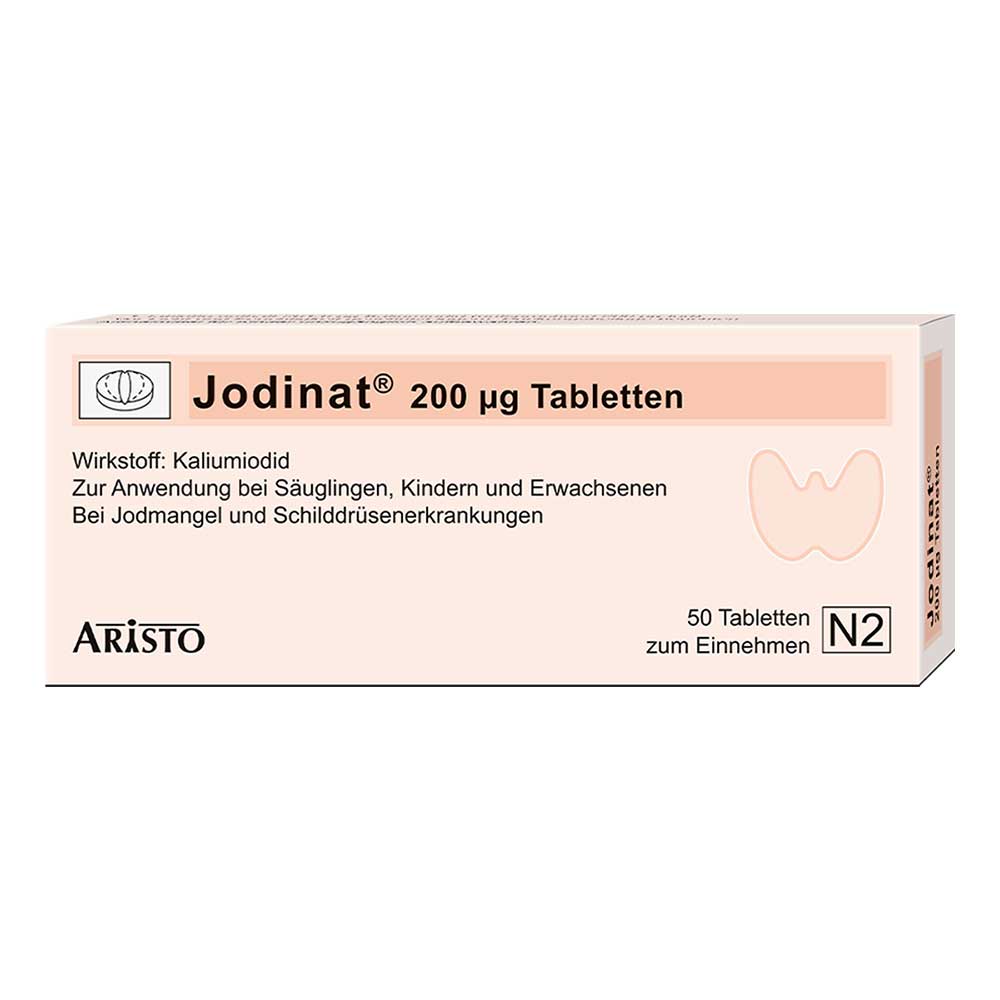 Jodinat® 200 µg Tabletten (apothekenpflichtig). Wirkstoff: Kaliumiodid Zur Vorbeugung eines Iodmangels (z. B. zur Vorbeugung eines Kropfes in Iodmangelgebieten und nach Entfernung eines Iodmangelkropfes) und zur Behandlung eines Kropfes (diffuse euthyreote Struma) bei Neugeborenen, Kindern, Jugendlichen und jüngeren Erwachsenen. Zu Risiken und Nebenwirkungen lesen Sie die Packungsbeilage und fragen Sie Ihre Ärztin, Ihren Arzt oder in Ihrer Apotheke. (Stand Februar 2012). Aristo Pharma GmbH, Wallenroder 8-10, 13435 Berlin.