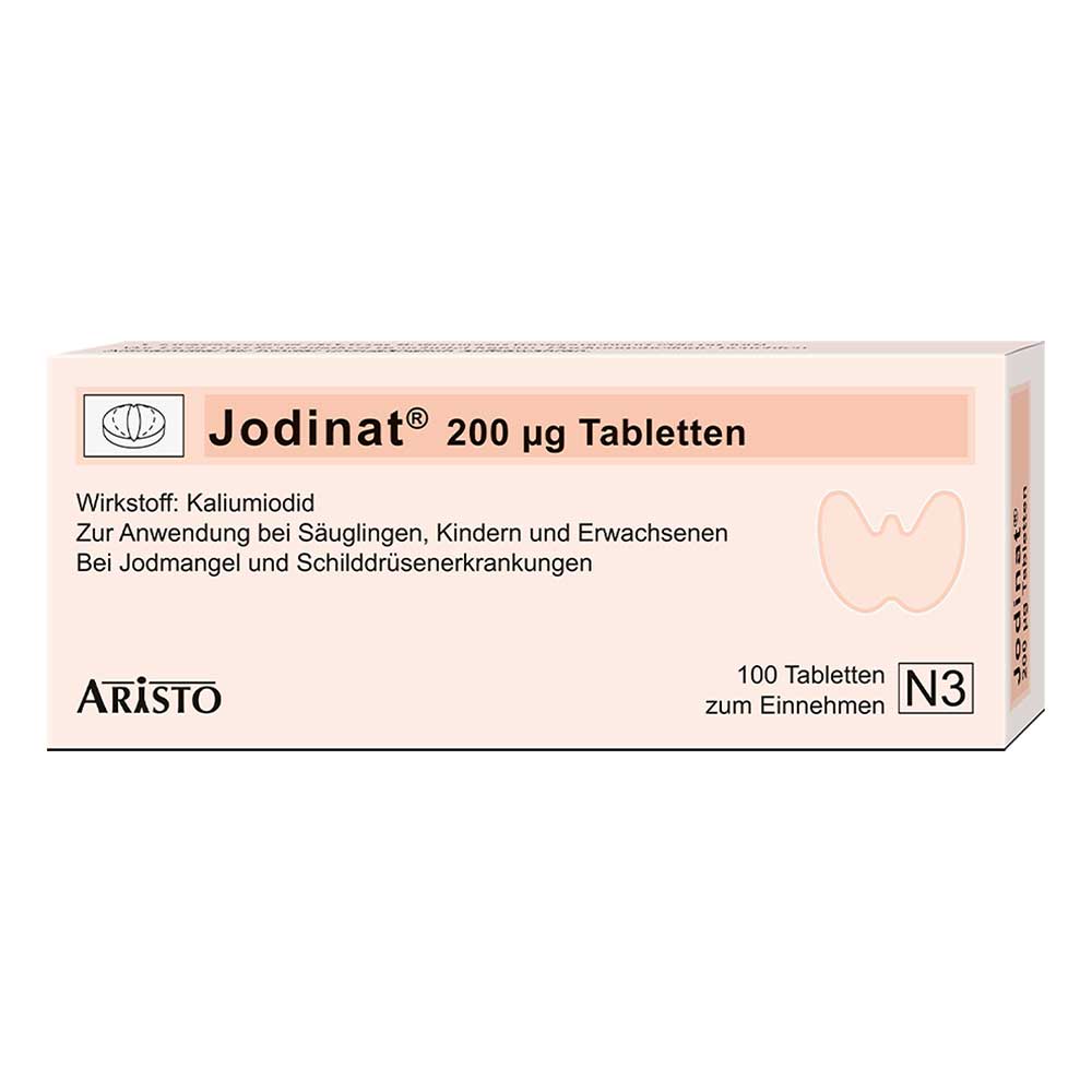 Jodinat® 200 µg Tabletten (apothekenpflichtig). Wirkstoff: Kaliumiodid Zur Vorbeugung eines Iodmangels (z. B. zur Vorbeugung eines Kropfes in Iodmangelgebieten und nach Entfernung eines Iodmangelkropfes) und zur Behandlung eines Kropfes (diffuse euthyreote Struma) bei Neugeborenen, Kindern, Jugendlichen und jüngeren Erwachsenen. Zu Risiken und Nebenwirkungen lesen Sie die Packungsbeilage und fragen Sie Ihre Ärztin, Ihren Arzt oder in Ihrer Apotheke. (Stand Februar 2012). Aristo Pharma GmbH, Wallenroder 8-10, 13435 Berlin.