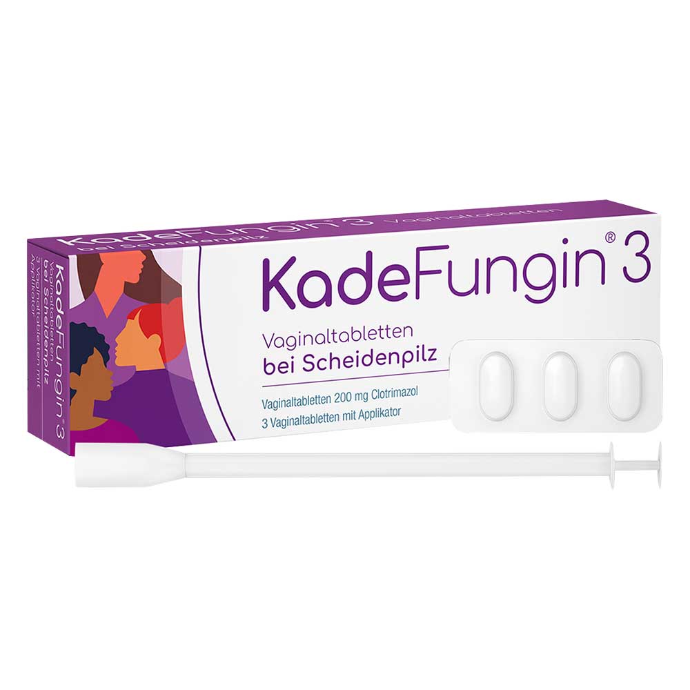 KadeFungin® 3 Vaginaltabletten. Wirkstoff: Clotrimazol. Anwendungsgebiete: Infektionen der Scheide und des äußeren Genitalbereiches durch Hefepilze (meist Candida albicans). Packungsbeilage beachten. Zu Risiken und Nebenwirkungen lesen Sie die Packungsbeilage und fragen Sie Ihre Ärztin, Ihren Arzt oder in Ihrer Apotheke. Stand: 10/2019