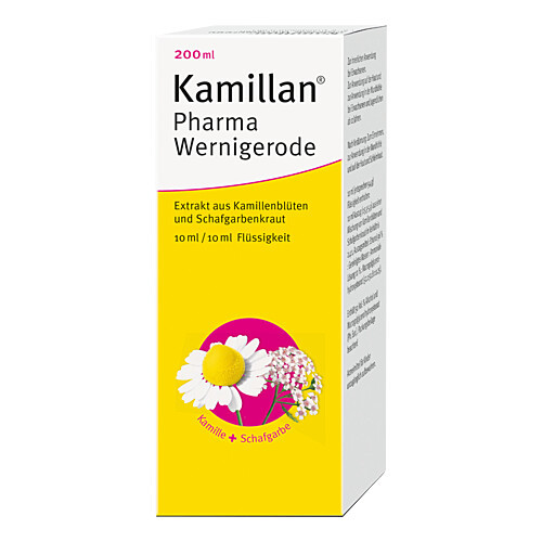 Kamillan® Pharma Wernigerode Extrakt aus Kamillenblüten und Schafgarbenkraut 10 ml / 10 ml. Traditionelles pflanzliches Arzneimittel angewendet zur Unterstützung der Magen-Darm-Funktion; zur Unterstützung der Hautfunktion; zur Unterstützung der Funktion der Schleimhäute im Mund- und Rachenbereich. Dieses Arzneimittel ist ein traditionelles Arzneimittel, das ausschließlich auf Grund langjähriger Anwendung für das Anwendungsgebiet registriert ist. Enthält 50 Vol.-% Alkohol und Macrogolglycerolhydroxystearat (Ph. Eur.); Packungsbeilage beachten! Zu Risiken und Nebenwirkungen lesen Sie die Packungsbeilage und fragen Sie Ihre Ärztin, Ihren Arzt oder in Ihrer Apotheke. (Stand November 2023). Aristo Pharma GmbH, Wallenroder Straße 8-10, 13435 Berlin.
