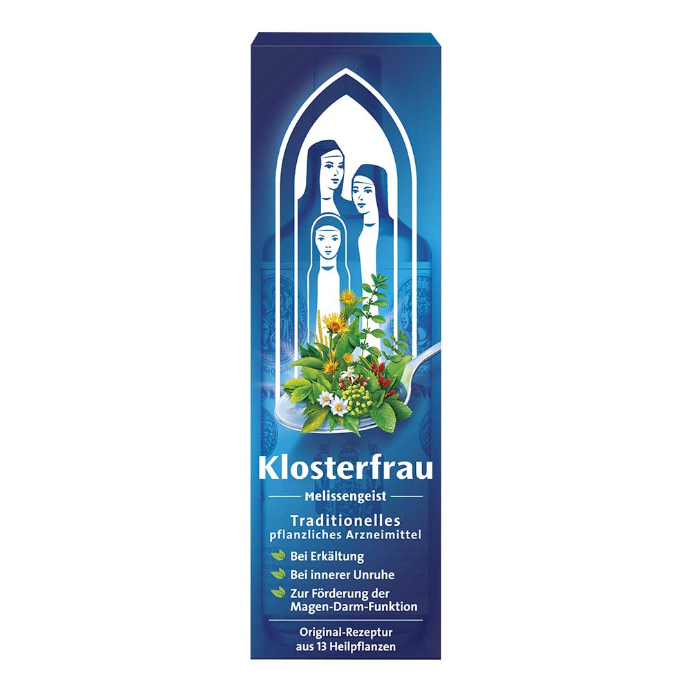 Klosterfrau Melissengeist. Anwendungsgebiete: Traditionelles pflanzliches Arzneimittel angewendet: Innerlich: Zur Besserung des Allgemeinbefindens (bzw. zur Stärkung oder Kräftigung) bei Belastung von Nerven und Herz-Kreislauf mit innerer Unruhe und Nervosität. Zur Förderung der Schlafbereitschaft. Bei Wetterfühligkeit. Zur Besserung des Befindens bei Unwohlsein, zur Förderung der Funktion von Magen und Darm, insbesondere bei Neigung zu Völlegefühl und Blähungen. Zur Besserung des Befindens bei unkomplizierten Erkältungen und zur Stärkung. Äußerlich: Zur Unterstützung der Hautdurchblutung z. B. bei Muskelkater und Muskelver-spannungen. Das Arzneimittel ist ein traditionelles Arzneimittel, das ausschließlich auf Grund langjähriger Anwendung für das Anwendungsgebiet registriert ist. Warnhinweise: Enthält 3,1 g Alkohol (Ethanol) pro 5 ml Flüssigkeit entsprechend 79 % (v/v). Enthält Zimt (Zimtaldehyd). Packungsbeilage beachten. Zu Risiken und Nebenwirkungen lesen Sie die Packungsbeilage und fragen Sie Ihre Ärztin, Ihren Arzt oder in Ihrer Apotheke.