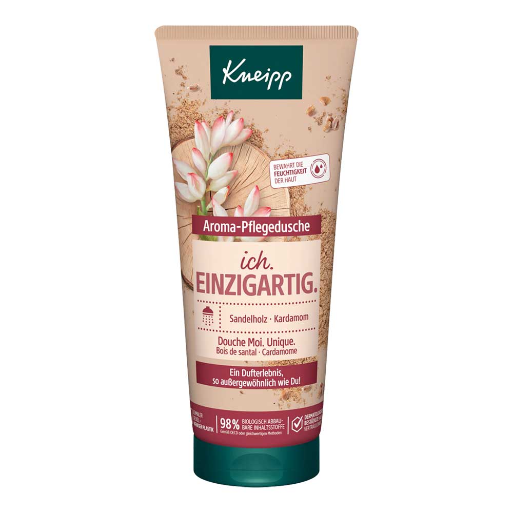 Die Kneipp Aroma-Pflegedusche Ich. Einzigartig ist so facettenreich und unvergleichlich wie Sie. Warme und holzige Nuancen schenken Ihnen ein luxuriöses Duft- und Duscherlebnis. Die Kombination von Duft und natürlichen Extrakten aus Sandelholz und Kardamom ist außergewöhnlich und genauso besonders wie Sie.