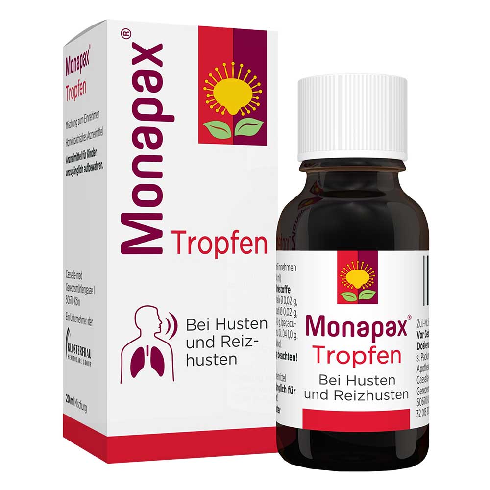 Monapax® Tropfen. Anwendungsgebiete: Die Anwendungsgebiete leiten sich von den homöopathischen Arzneimittelbildern ab. Dazu gehört: Husten. Warnhinweis: Enthält 32,8 Vol.-% Alkohol. Packungsbeilage beachten! Zu Risiken und Nebenwirkungen lesen Sie die Packungsbeilage und fragen Sie Ihre Ärztin, Ihren Arzt oder in Ihrer Apotheke.