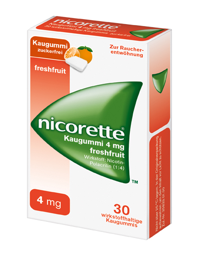 Nicorette® Kaugumm 4 mg freshmint wirkstoffhaltiges Kaugummi. Wirkstoff: Nicotin (als Nicotin-Polacrilin (1:4)). Anwendungsgebiete: Behandlung der Tabakabhängigkeit durch Linderung der Nicotinentzugserscheinungen. Unterstützung der Raucherentwöhnung. Auch zur Verringerung des Zigarettenkonsums (Rauchreduktion), um auf diesem Weg den Rauchausstieg zu erreichen. Warnhinweise: Enthält Levomenthol, Pfefferminzöl, Butylhydroxytoluol (E 321). Stand: 05/2025