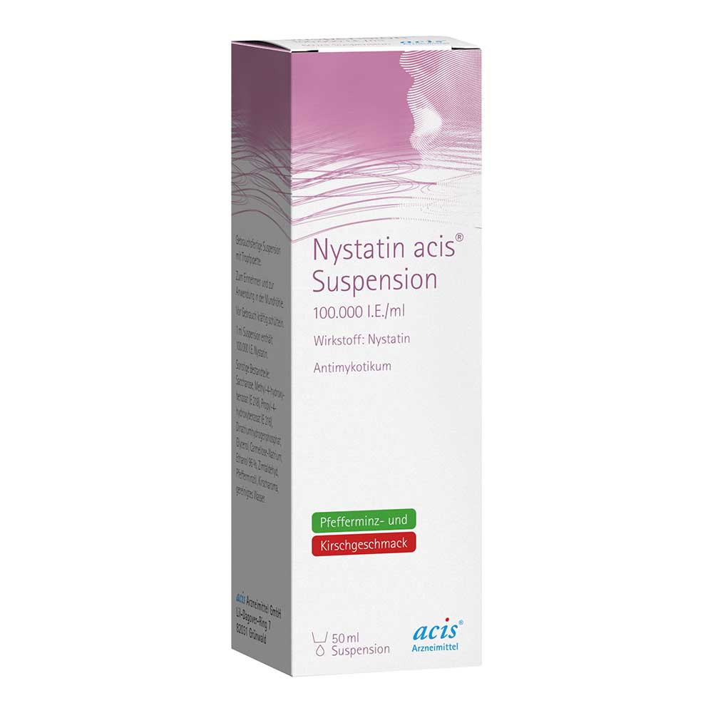 Nystatin acis® Suspension Wirkstoff: Nystatin. Anwendungsgebiete: Zur lokalen Behandlung des Mundsoors und zur Sanierung des Darms bei Hefebefall. Besonders geeignet für Neugeborene, Kleinkinder und schluckbehinderte Patienten. Warnhinweise: Enthält Parabene E 216/ E 218, Saccharose, Pfefferminzöl, Zimt (Zimtaldehyd) und Alkohol (Ethanol). Zu Risiken und Nebenwirkungen lesen Sie die Packungsbeilage und fragen Sie Ihre Ärztin, Ihren Arzt oder in Ihrer Apotheke. Stand: 03/2025.