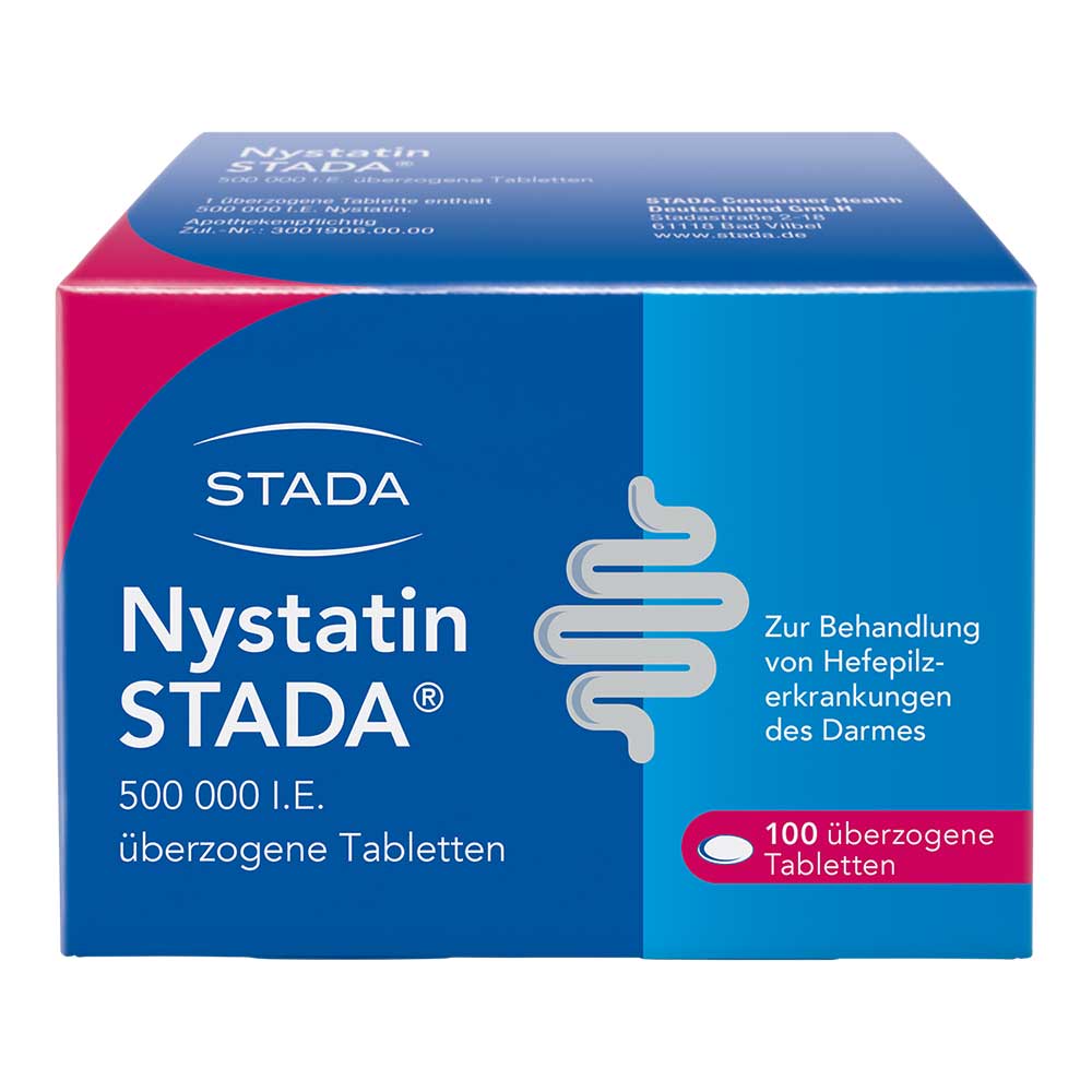 Nystatin STADA® 500.000 I.E. überzogene Tabletten Wirkstoff: Nystatin. Zur topischen intestinalen Behandlung nachgewiesener nystatinempfindlicher Hefepilzinfektionen, insbesondere als Folge einer Therapie mit Antibiotika, Zytostatika oder Kortikoiden. Enthält Glucose, Lactose und Sucrose (Zucker). Zu Risiken und Nebenwirkungen lesen Sie die Packungsbeilage und fragen Sie Ihren Arzt und Apotheker. STADAPHARM GmbH, Stadastraße 2-18, 61118 Bad Vilbel. Stand: Juli 2020