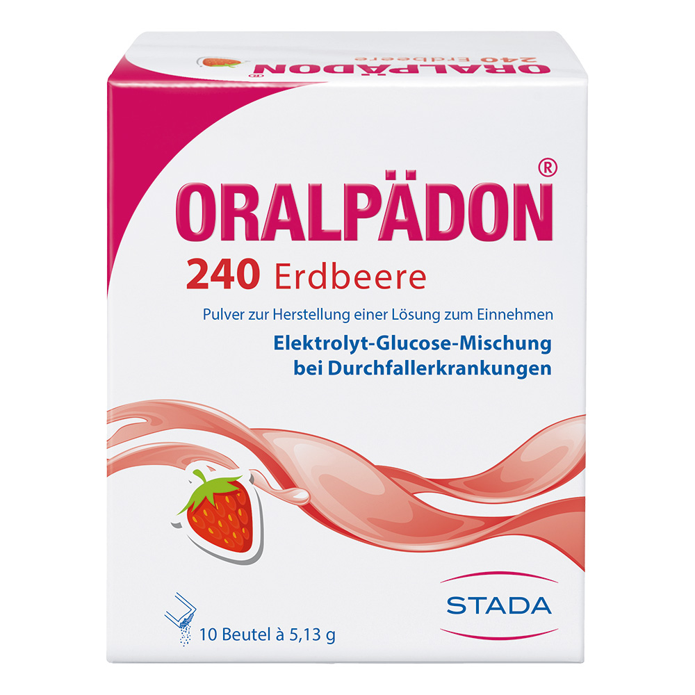 Oralpädon® 240 Erdbeere Pulver zur Herstellung einer Lösung zum Einnehmen Wirkstoffe: Natriumchlorid, Kaliumchlorid, Glucose-Monohydrat, Dinatriumhydrogencitrat 1,5 H2O. Zur oralen Salz- (Elektrolyt-) und Flüssigkeitszufuhr (Ausgleich von Salz- und Wasserverlusten) bei Durchfallerkrankungen. Hinweise: Jeder Durchfall kann Anzeichen einer schweren Erkrankung sein. Bei längerer Dauer und/oder Beeinträchtigung des Allgemeinbefindens ist daher unverzüglich ein Arzt aufzusuchen. Insbesondere bei Säuglingen und Kleinkindern können Durchfälle, besonders bei gleichzeitigem, unstillbarem Erbrechen, rasch zu schweren Krankheitserscheinungen (Bewusstseinstrübung, Schock) führen. Es ist daher bei der Durchfallbehandlung von Säuglingen und Kleinkindern in jedem Fall ein Arzt hinzuzuziehen. Enthält Glucose, Kaliumchlorid, Natriumverbindungen und Aspartam. Zu Risiken und Nebenwirkungen lesen Sie die Packungsbeil age und fragen Sie Ihren Arzt oder Apotheker. STADA Consumer Health Deutschland GmbH, Stadastraße 2–18, 61118 Bad Vilbel. Stand: September 2019