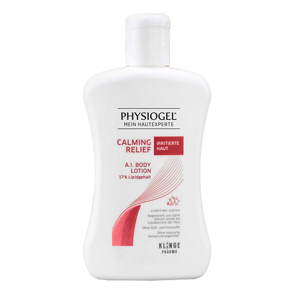 Die Physiogel Calming Relief A.I. Body Lotion ist eine leichte, juckreizmildernde Hautpflege für empfindliche, irritierte und trockene Haut. Durch einen hautberuhigenden Wirkkomplex aus hautverwandten Lipiden und Palmitoylethanolamin (PEA) lindert sie Juckreiz und Rötungen. Außerdem spendet sie trockener Haut Feuchtigkeit, was vor allem bei Neurodermitis-Patienten wichtig ist, da ihre Haut durch eine Störung der Hautbarriere zu viel Feuchtigkeit abgibt und austrocknet.