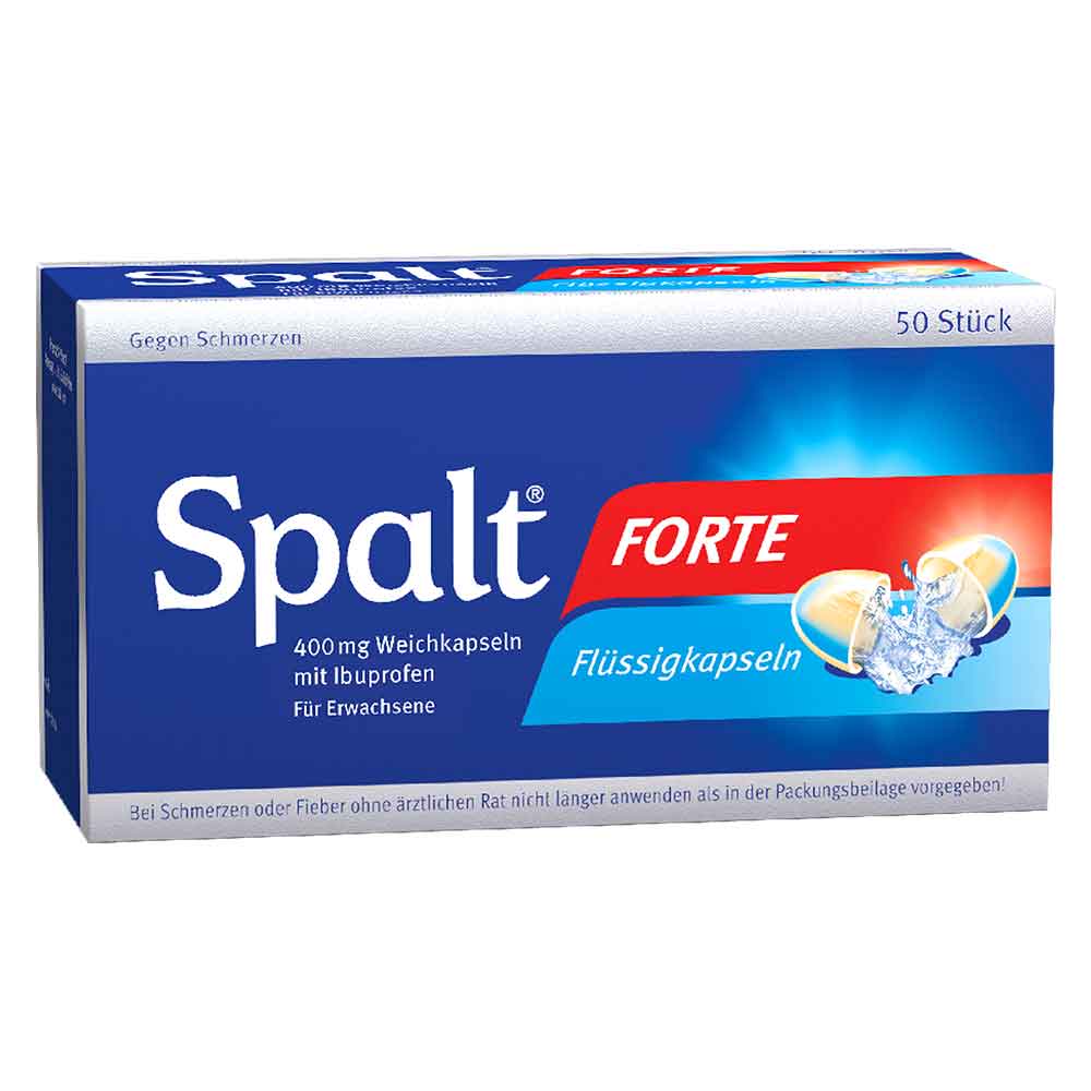 SPALT FORTE. Wirkstoff: Ibuprofen. Kurzzeitige symptomatische Behandlung von leichten bis mäßig starken Schmerzen wie Kopfschmerzen, Zahnschmerzen, Regelschmerzen; Fieber. Spalt Forte soll nicht längere Zeit oder in höherer Dosierung ohne ärztlichen oder zahnärztlichen Rat eingenommen werden. Bei Schmerzen oder Fieber ohne ärztlichen Rat nicht länger anwenden als in der Packungsbeilage vorgegeben! www.spalt-online.de. Zu Risiken und Nebenwirkungen lesen Sie die Packungsbeilage und fragen Sie Ihre Ärztin, Ihren Arzt oder in Ihrer Apotheke. PharmaSGP GmbH, 82166 Gräfelfing