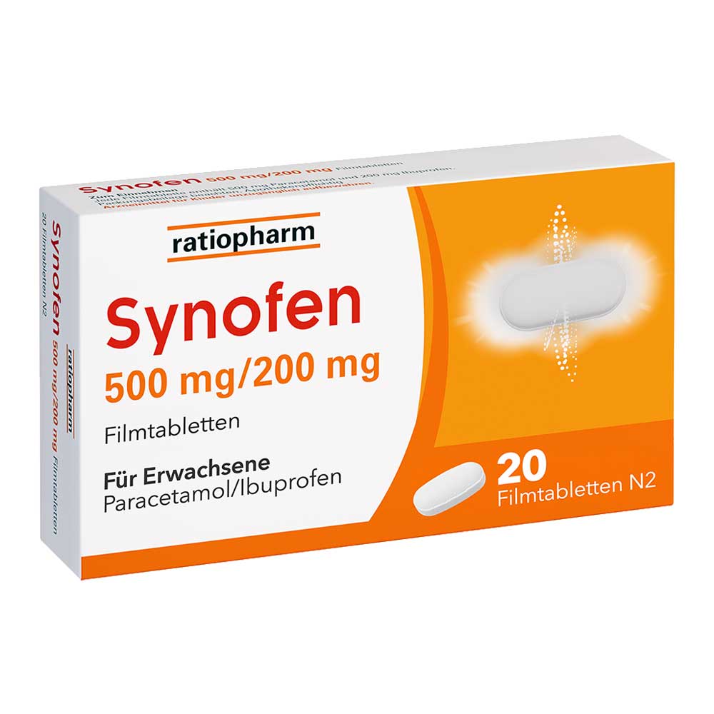 Synofen.Wirkstoff: 500 mg Paracetamol, 200 mg Ibuprofen. Anwendungsgebiete: Synofen wird angewendet zur kurzzeitigen symptomatischen Behandlung von leichten bis mäßig starken Schmerzen. Synofen ist speziell anwendbar bei Schmerzen, die durch alleinige Anwendung von Ibuprofen oder Paracetamol nicht gelindert werden können. Apothekenpflichtig. Zu Risiken und Nebenwirkungen lesen Sie die Packungsbeilage und fragen Sie Ihre Ärztin, Ihren Arzt oder in Ihrer Apotheke. 2/25.