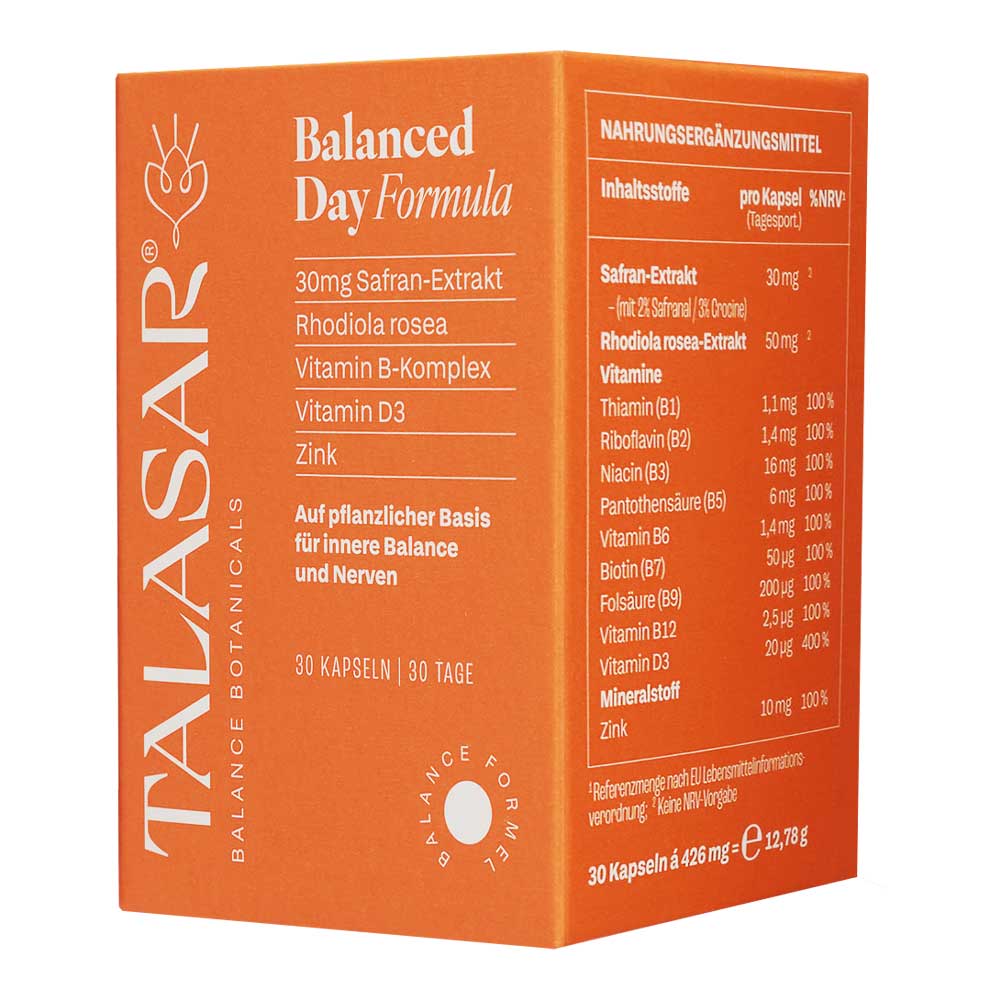 Talasar vereint in seiner einzigartigen Plus-Formel echten Safran in höchster Qualität, Rhodiola rosea-Extrakt (Rosenwurz), Vitamin-B-Komplex, Zink und Vitamin D3.