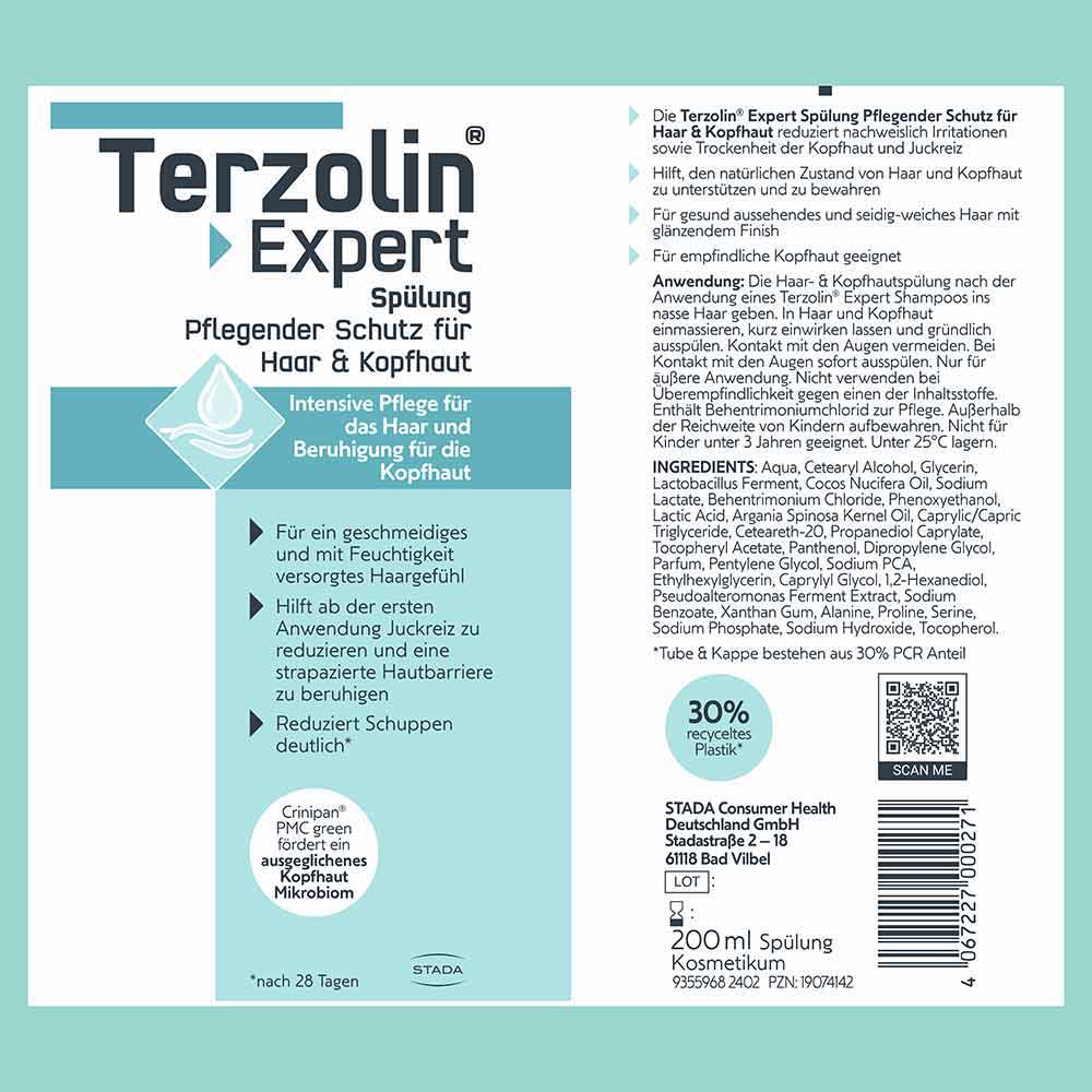 Wie wirkt die Terzolin® Expert Spülung Pflegender Schutz für Haar & Kopfhaut? Die Terzolin® Expert Spülung Pflegender Schutz für Haar & Kopfhaut beruhigt, hydratisiert und pflegt intensiv die Kopfhaut und das Haar. Die Inhaltsstoffen SymFerment® und Meeresferment-Extrakt speichern dabei langanhaltend Feuchtigkeit, während pflanzliche Öle dem Haar mehr Geschmeidigkeit und Glanz verleihen. Zusätzlich, reduziert die Spülung trockene und fettige Schuppen nachweislich.