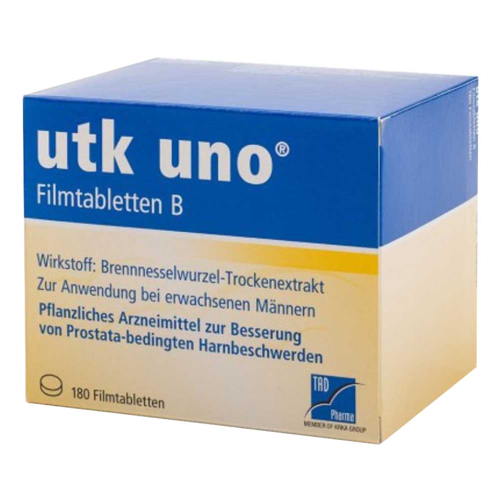 utk uno® Filmtabletten B. Wirkstoff: Trockenextrakt aus Brennesselwurzel. Anwendungsgebiete: utk uno® wird von Männern angewendet gegen Beschwerden beim Wasserlassen bei einer gutartigen Vergrößerung der Vorsteherdrüse (Prostata) im Stadium I bis II nach Alken bzw. II bis III nach Vahlensieck. Eine Behandlung mit utk uno® sollte nur nach ärztlicher Diagnose mit Ausschluss ernster Erkrankungen im Bereich der Harnwege erfolgen. Dieses Medikament behebt nicht die Vergrößerung der Prostata. Warnhinweis: Arzneimittel enthält Lactose. Präparat erst nach Rücksprache mit dem Arzt einnehmen, wenn eine Unverträglichkeit gegenüber bestimmten Zuckern vorliegt. Zu Risiken und Nebenwirkungen lesen Sie die Packungsbeilage und fragen Sie Ihre Ärztin, Ihren Arzt oder in Ihrer Apotheke. Stand: Mai 2012