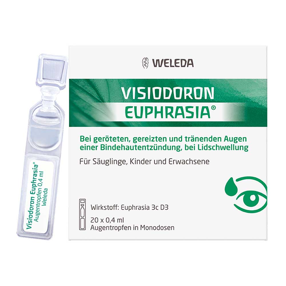 Visiodoron Euphrasia® Augentropfen Wirkstoff: Euphrasia 3c D3 Gemäß der anthroposophischen Menschen- und Naturerkenntnis. Dazu gehören: Katarrhalische Entzündungen am Auge, die mit vermehrter Tränenabsonderung einhergehen; Lidödeme, vor allem auf allergischer Grundlage. Dosierung und Art der Anwendung Soweit nicht anders verordnet, 3-mal täglich 1 Tropfen in den Bindehautsack träufeln. Zu Risiken und Nebenwirkungen lesen Sie die Packungsbeilage und fragen Sie Ihre Ärztin, Ihren Arzt oder in Ihrer Apotheke. Weleda AG, Schwäbisch Gmünd