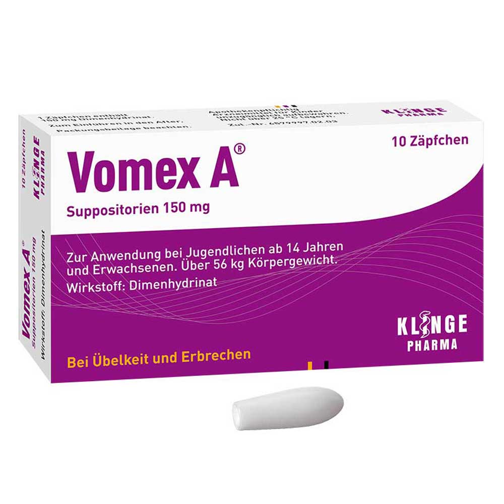 Vomex A® Suppositorien 150 mg, Zäpfchen: Wirkstoff: Dimenhydrinat. Anwendungsgebiet: Zur Vorbeugung und Behandlung von Übelkeit und Erbrechen unterschiedlichen Ursprungs, insbesondere bei Reisekrankheit. Für Jugendliche ab 14 Jahren und Erwachsene. Über 56 kg Körpergewicht. Warnhinweise: Arzneimittel f. Kinder unzugängl. aufbewahren. Stand: 12/20-2. Zu Risiken und Nebenwirkungen lesen Sie die Packungsbeilage und fragen Sie Ihre Ärztin, Ihren Arzt oder in Ihrer Apotheke. Klinge Pharma GmbH, 83607 Holzkirchen, Deutschland